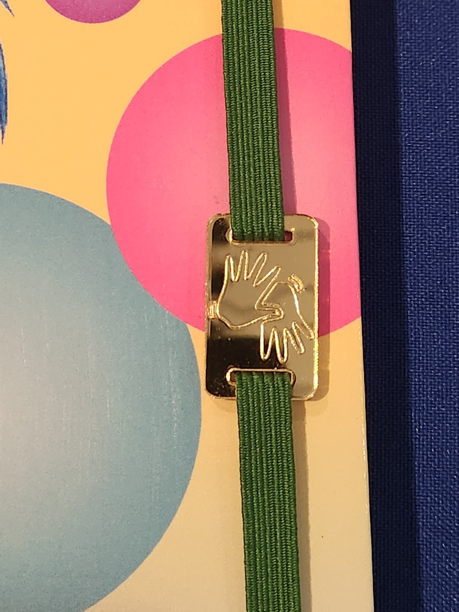 Fechamento com elástico e detalhe decorativo em acrílico com símbolo em Libras