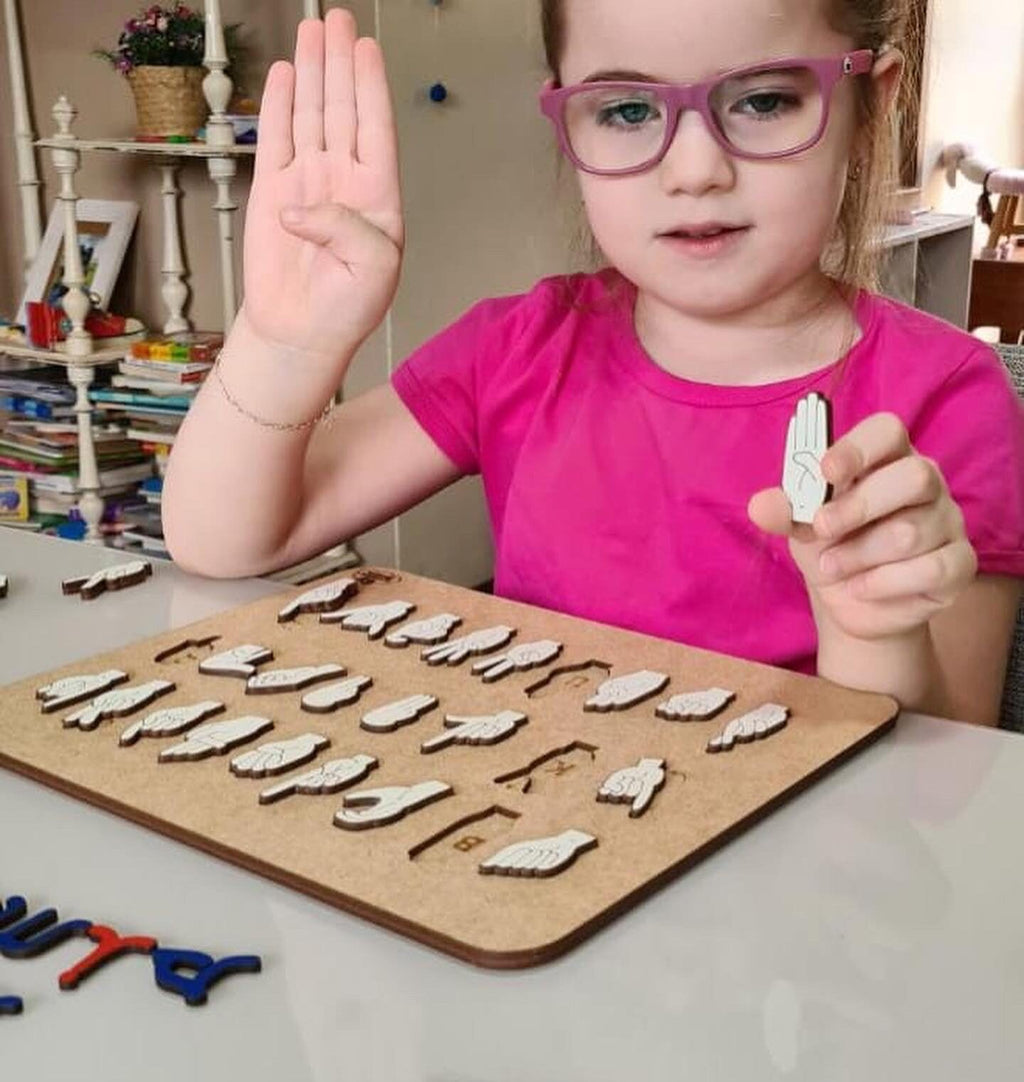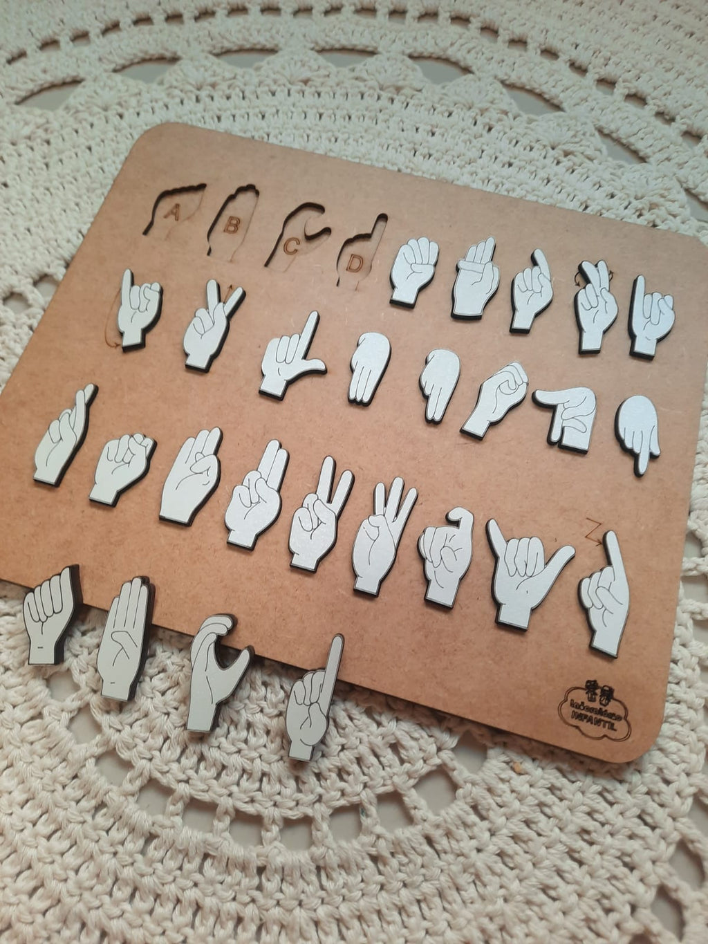 Cada peça mostra uma mão formando a letra correspondente no alfabeto manual, e no fundo do encaixe, a letra está gravada, permitindo que a criança associe o sinal à letra escrita.