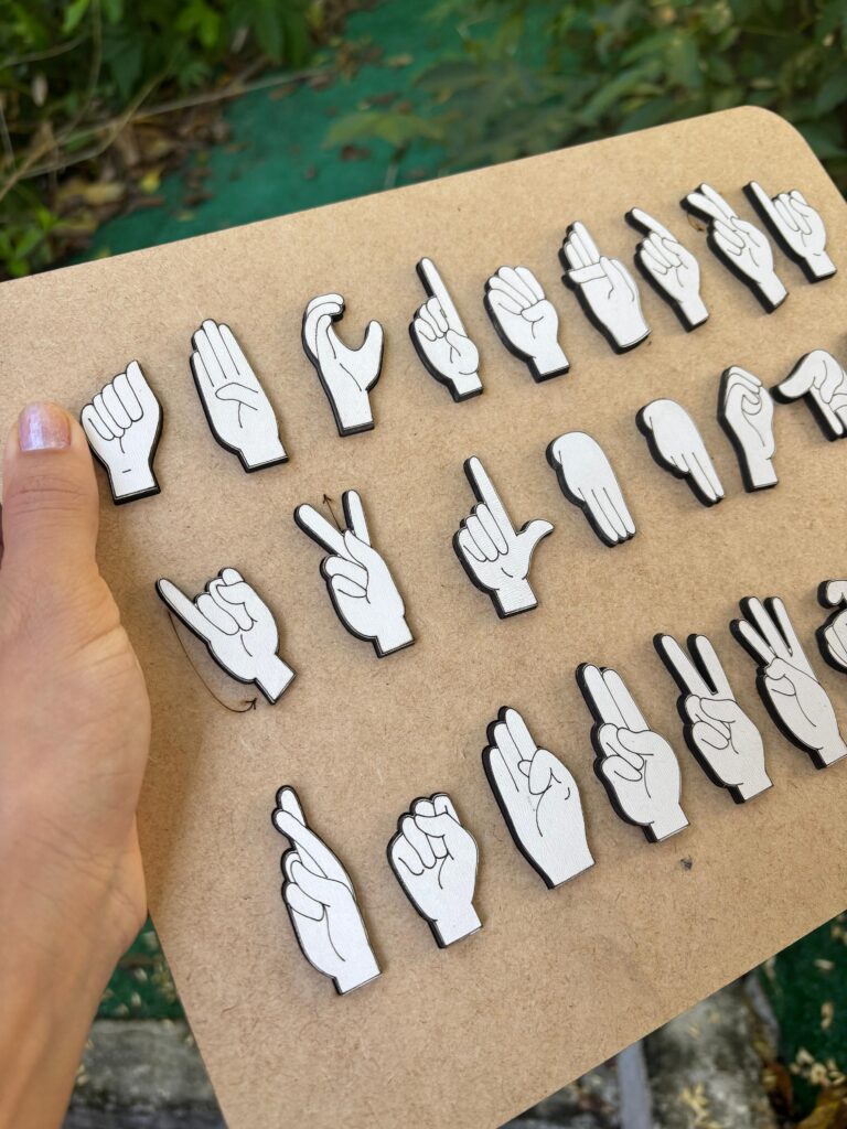 O jogo é composto por 26 peças do Alfabeto Manual (A–Z), todas encaixáveis, produzidas em MDF resistente e com foto impressa em cada peça, ilustrando a configuração das mãos correspondente a cada letra.