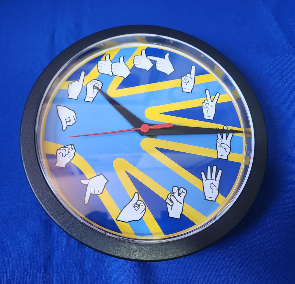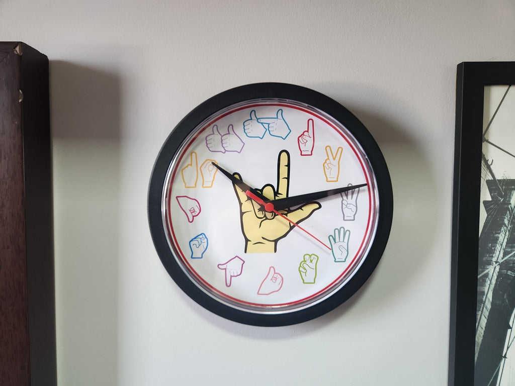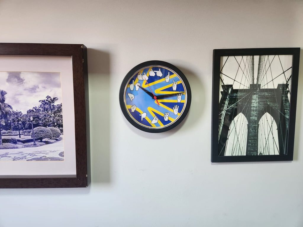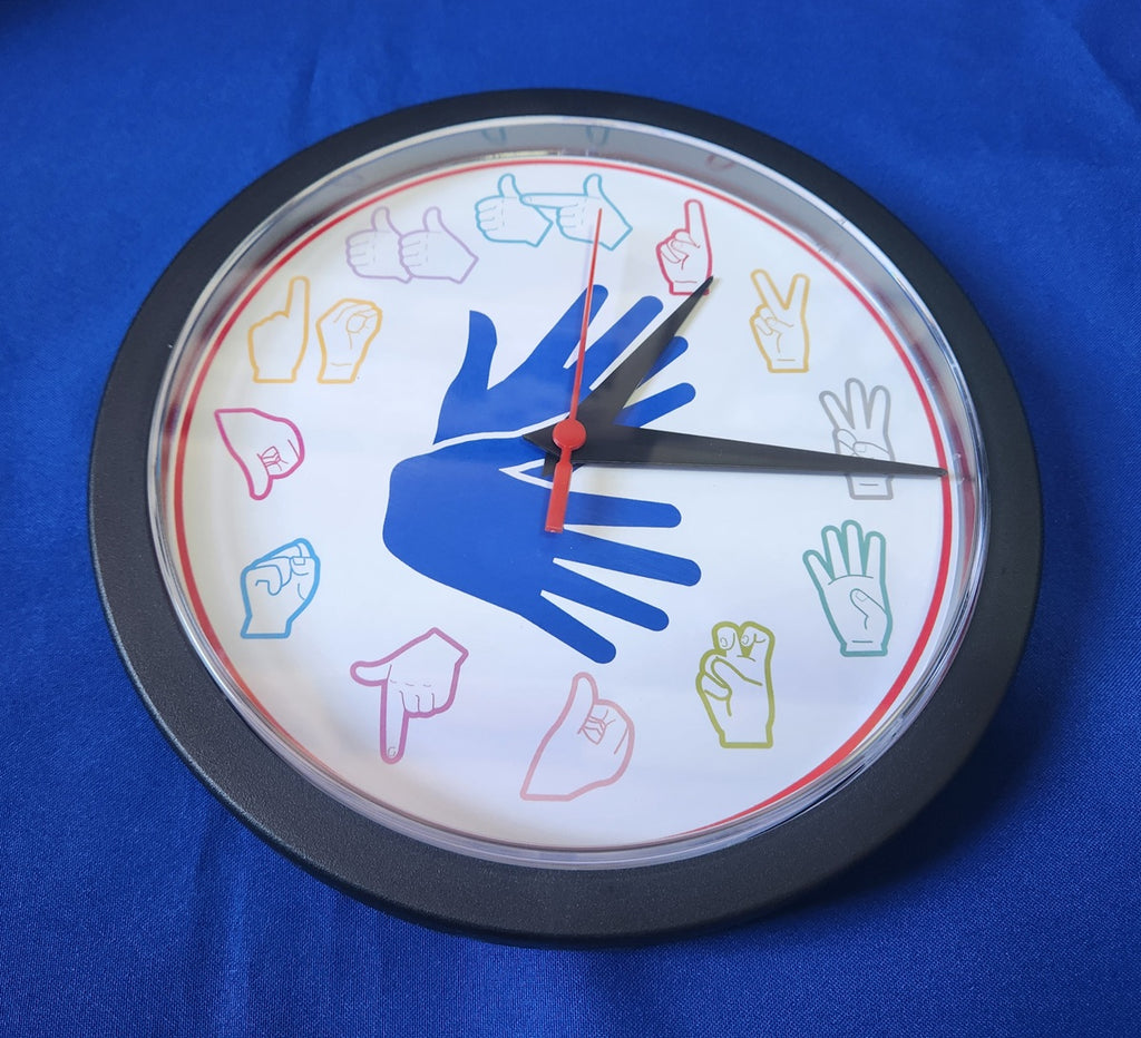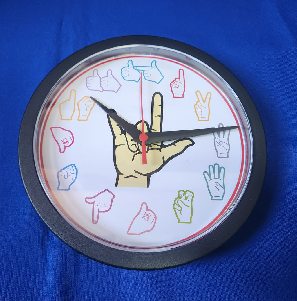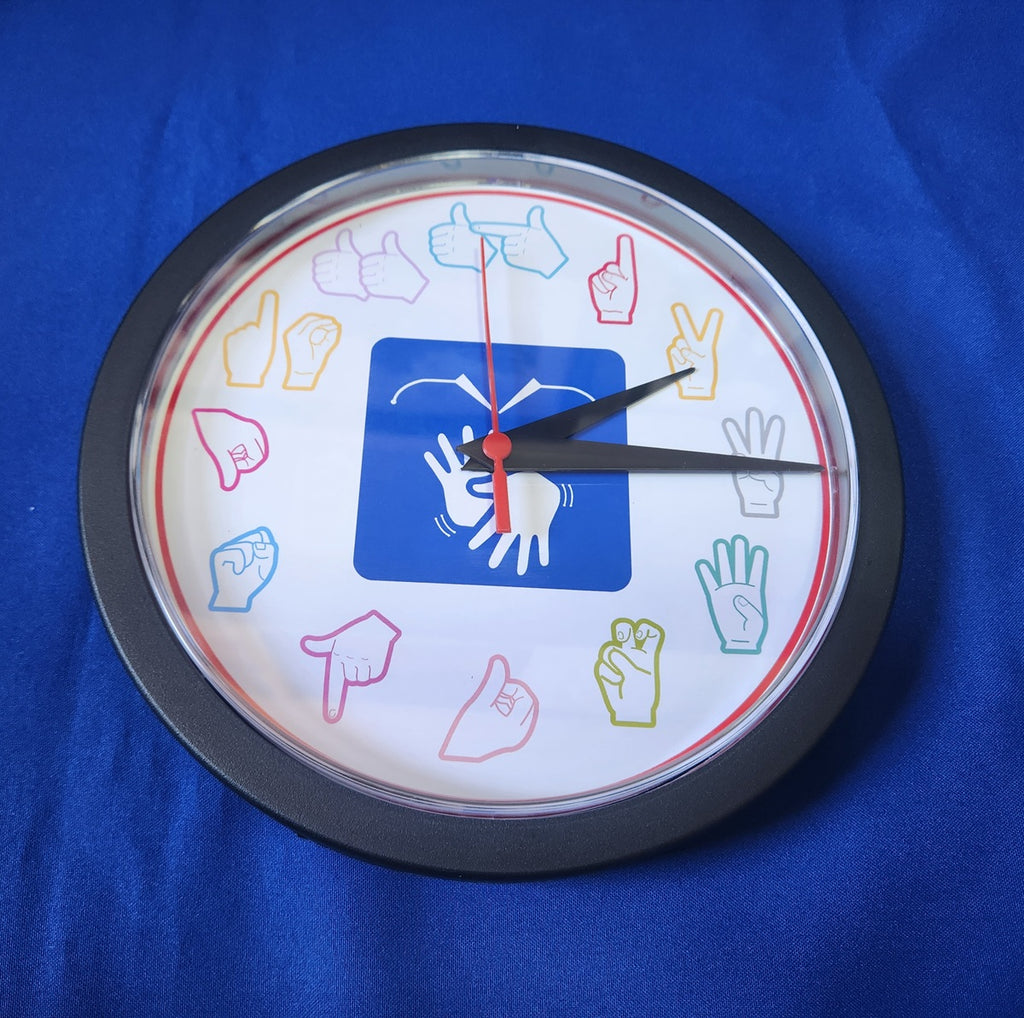 Este lindo relógio de parede traz desenhos inspirados na Língua Brasileira de Sinais (Libras), celebrando a cultura e identidade da comunidade surda.