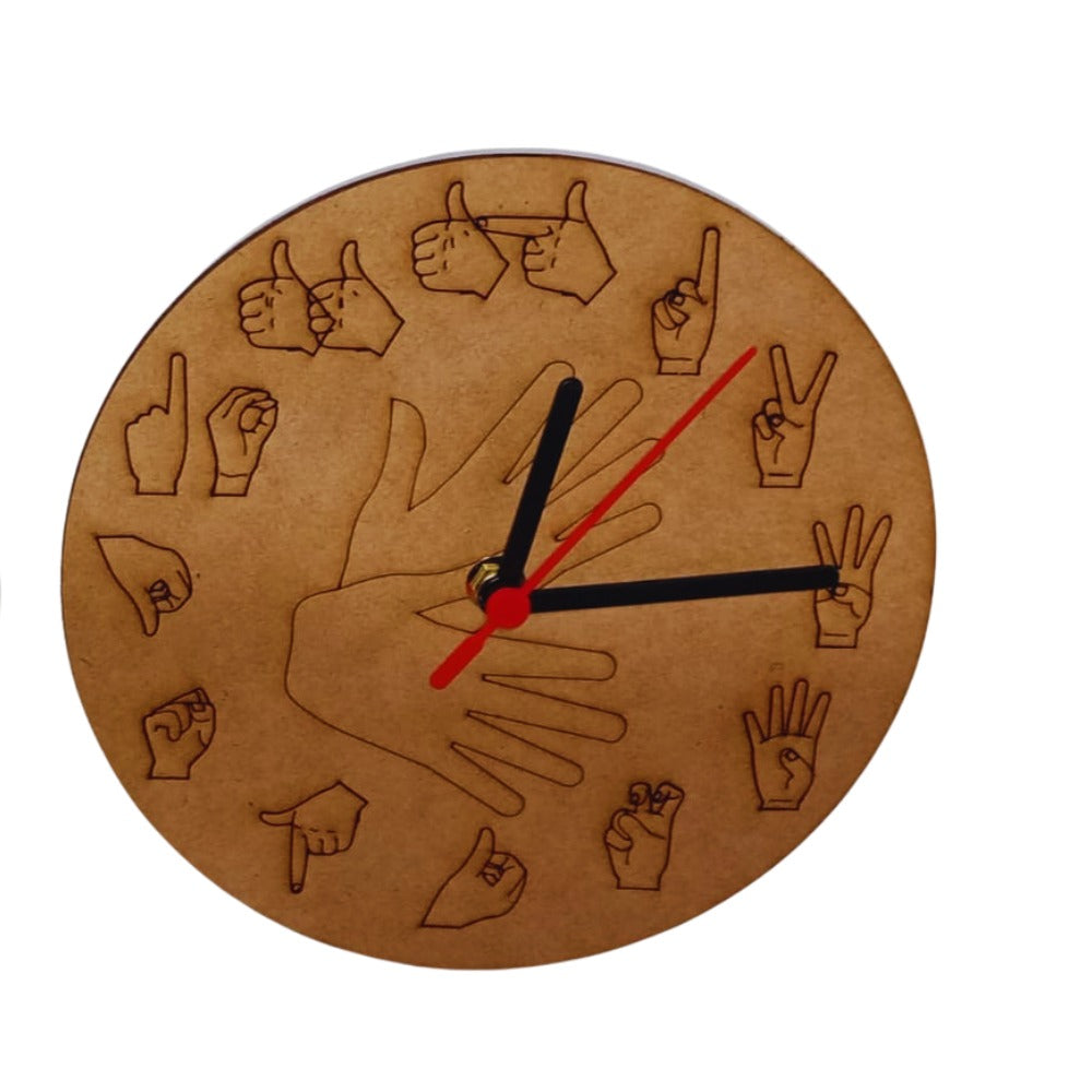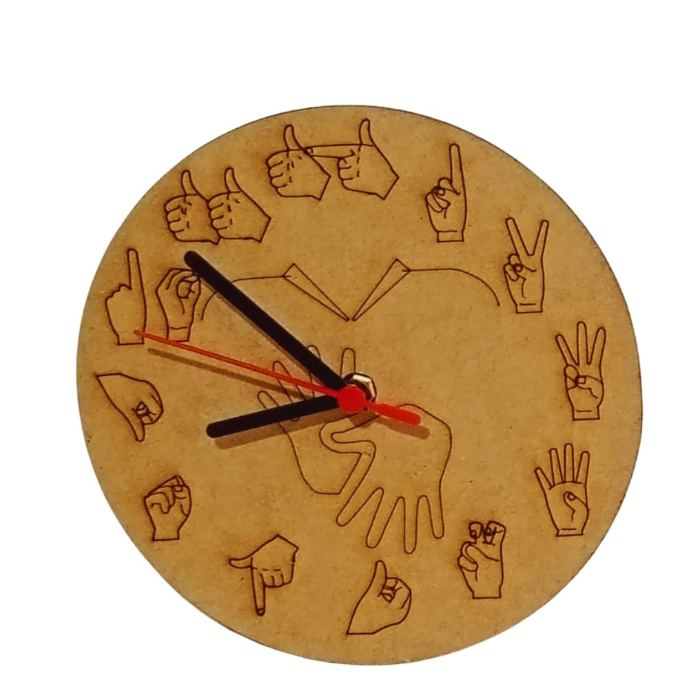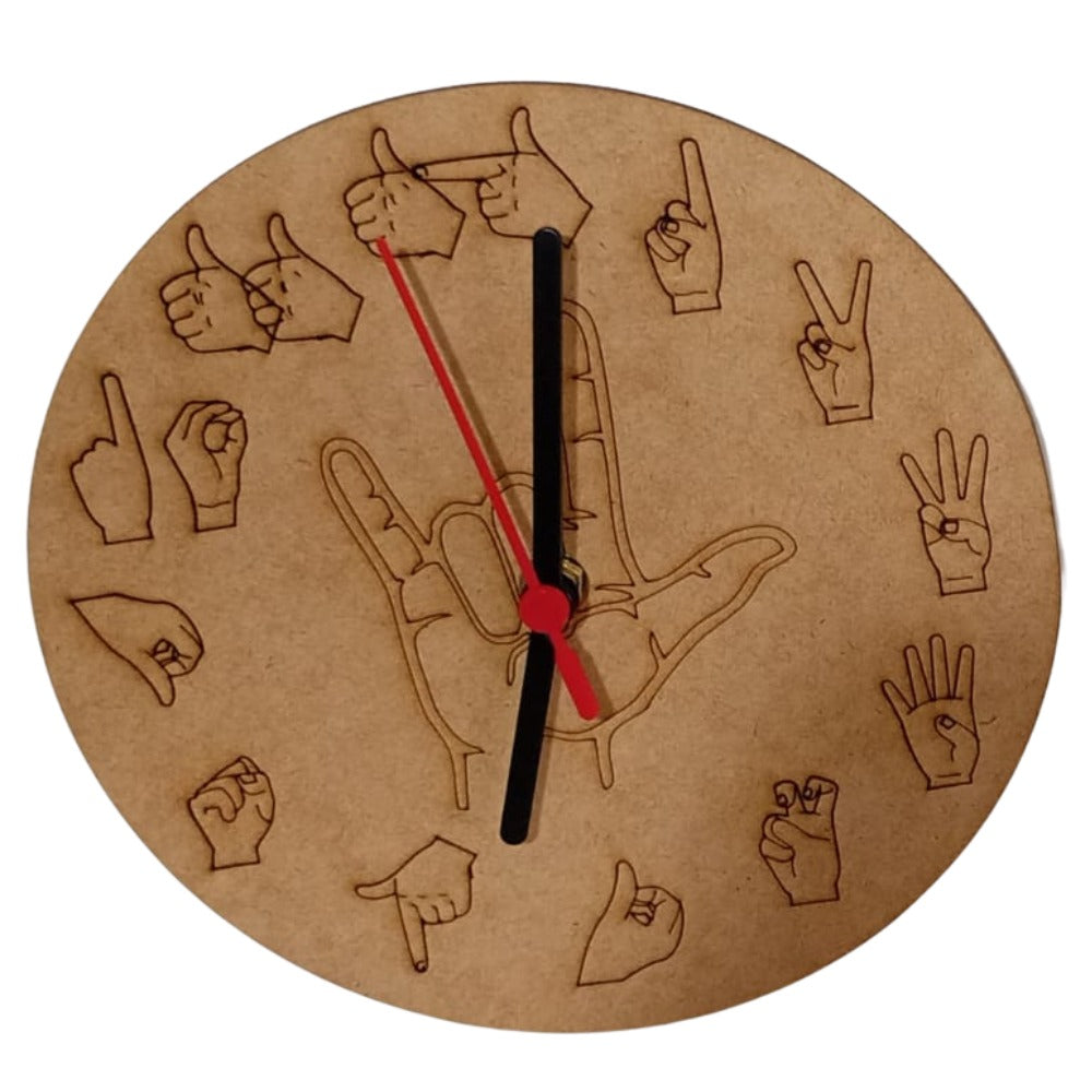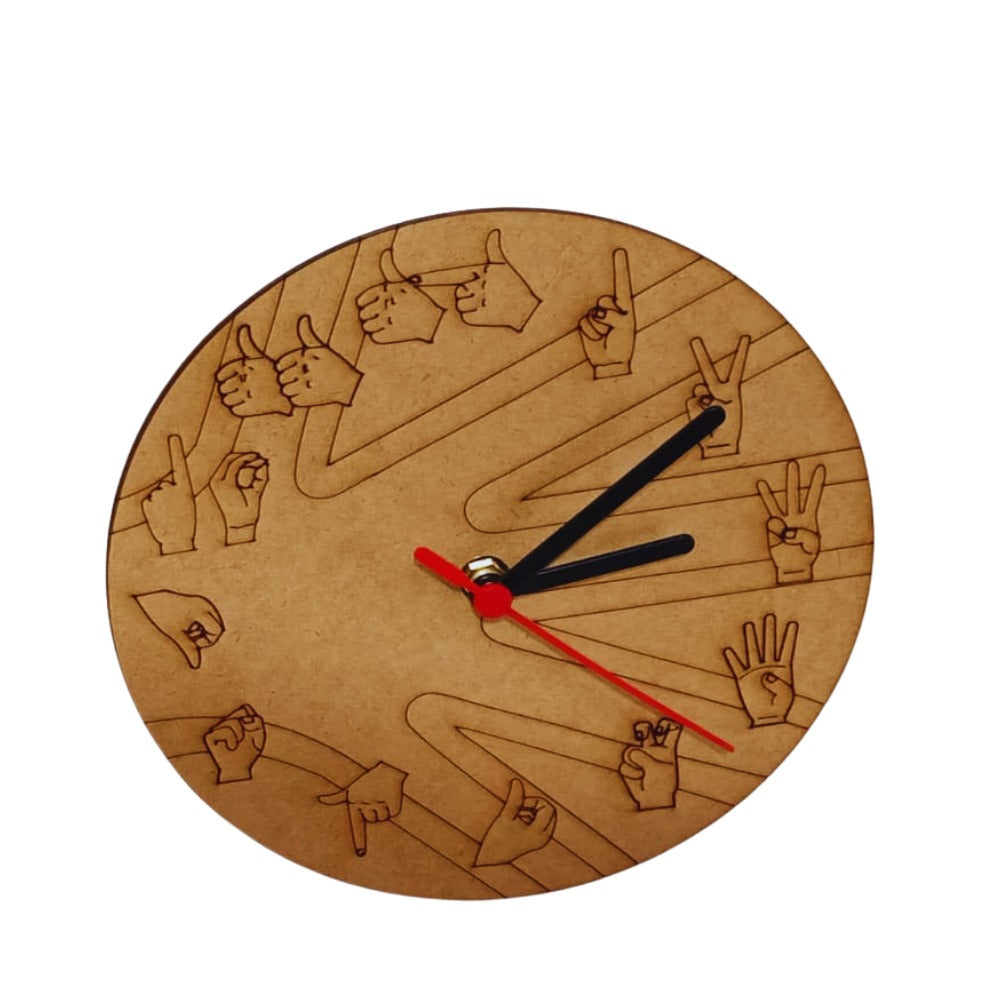 Este lindo relógio de parede traz desenhos inspirados na Língua Brasileira de Sinais (Libras), celebrando a cultura e identidade da comunidade surda.